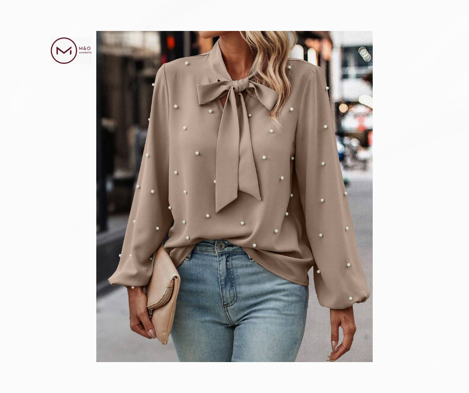 بلوز زنانه با طراحی ساده و رنگ یکدست، دارای آستینهای فانوسی است که به آن جلوهای خاص میبخشد. تزیین مروارید مصنوعی در قسمت جلوی بلوز، ظاهری زیبا و شیک را ایجاد میکند. این بلوز از جنس پارچهای با کیفیت و نرم تهیه شده و برای استفاده در فصول بهار و پاییز ایدهآل است.