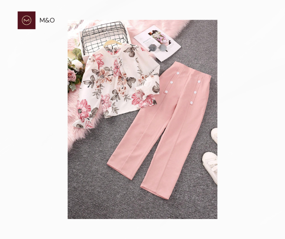 ست دو تکه شامل بلوز با طرح گل و آستین کلوش و شلوار دوبل، مناسب برای دختران نوجوان.