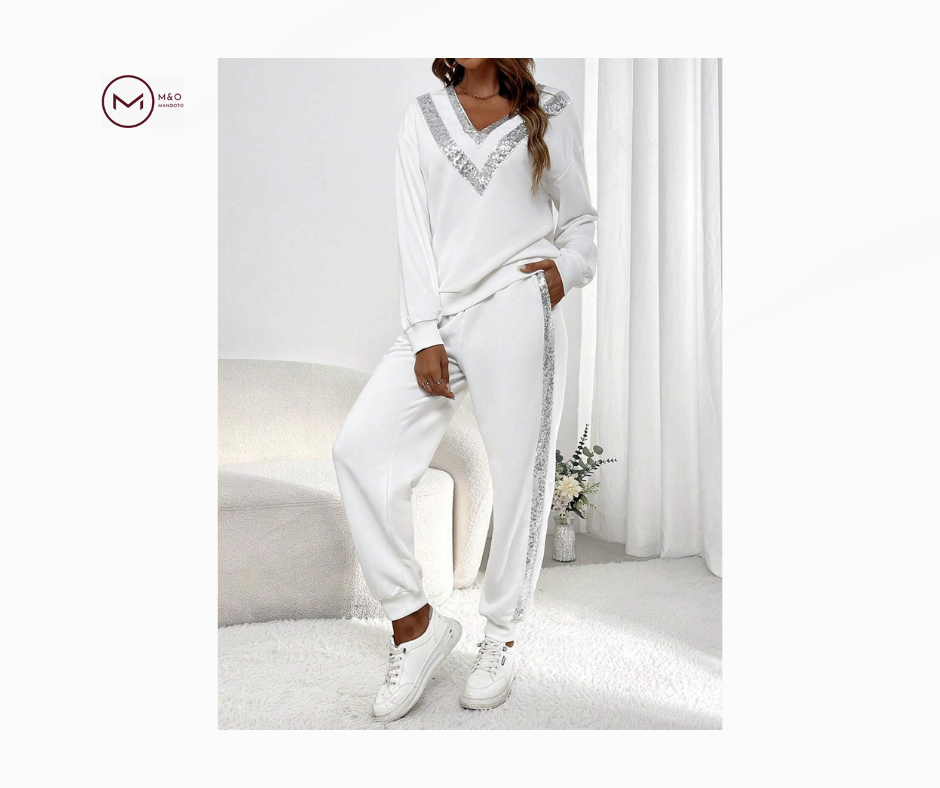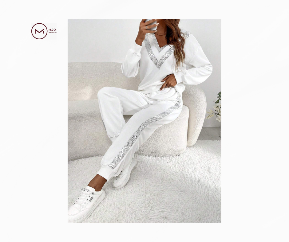 سویشرت این ست دارای طراحی سرشانه افتاده است که به آن ظاهری مدرن و آزاد میبخشد. جزئیات پولکی در قسمت حاشیه، جلوهای درخشان و جذاب به لباس میافزاید. شلوار ورزشی همراه نیز با فیت مناسب، راحتی و آزادی حرکت را تضمین میکند. این ترکیب برای فعالیتهای روزمره، استراحت در خانه یا گردشهای غیررسمی ایدهآل است