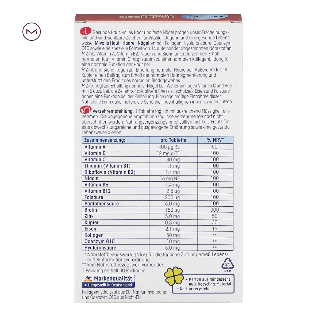 مکمل Mivolis Haut Haar Nägel (۳۰ عددی) محصولی باکیفیت ساخت آلمان است که ترکیبی از اجزای مراقبتی زیبایی را در یک قرص ارائه میدهد: کلاژن هیدرولیزشده (۵۰ mg)، هیالورونیکاسید (۳ mg)، کوآنزیم Q10 (۱۰ mg) و ۱۴ ماده مغذی شامل زینک، بیوتین، ویتامین A، B2، B6، B12، نیاسین، فولیکاسید، ویتامین C و E، مس و آهناین مواد مطابق با استانداردهای EFSA به حفظ سلامت پوست، ساخت طبیعی کلاژن، تقویت مو و ناخنها کمک مینمایند. زینک و بیوتین بهویژه در حفظ مو و ناخن مؤثر هستند؛ و مس در نگهداری رنگ مو و بافت همبند نقش دارد؛ و ویتامینهای C و E محافظت سلولی را ارائه میکنند.