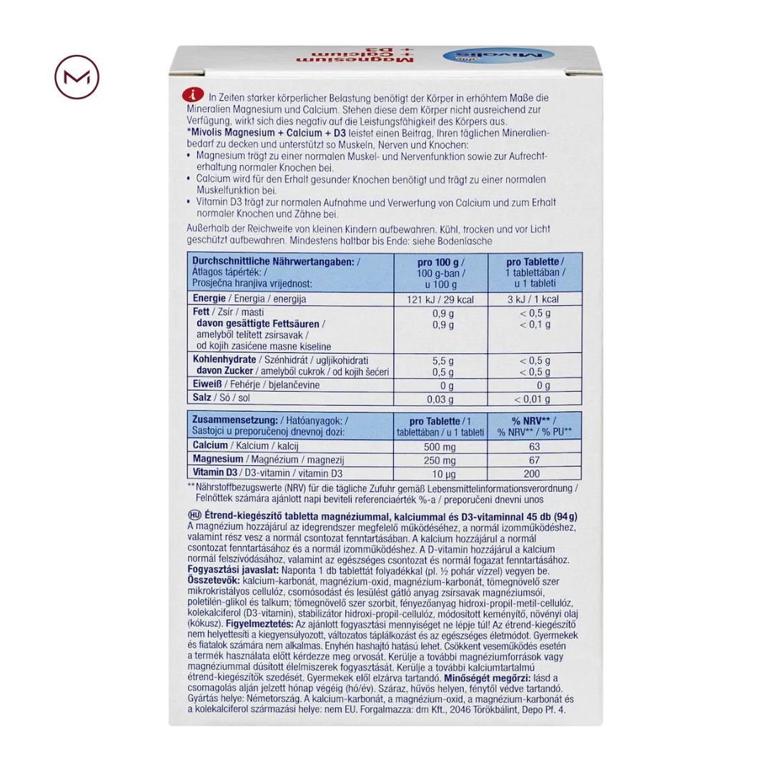 مکمل Mivolis Magnesium + Calcium + D3 یکی از محصولات محبوب برند DM آلمان است که در یک نسبت فیزیولوژیک ۲:۱ شامل کلسیم و منیزیم طراحی شده است. کلسیم برای حفظ ساختار و استحکام استخوانها و عملکرد مناسب عضلات ضروری است و منیزیم در آرامسازی عضلات و عملکرد سیستم عصبی نقش دارد. ویتامین D3 جذب کلسیم را تقویت کرده و برای سلامت استخوان و دندانها حیاتی است. این مکمل در دورههایی با فشار جسمی یا روحی بالا، برای تقویت عملکرد عضله، حفظ تراکم استخوان و تعادل الکترولیتی مناسب است.