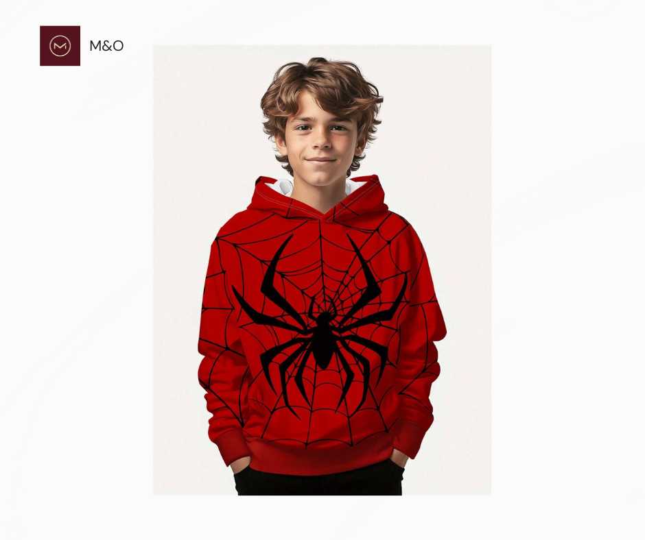 این هودی برای پسران نوجوان طراحی شده است. دارای طرح عنکبوت کارتونی در جلوی لباس است که جذابیت خاصی به آن میبخشد. طراحی آزاد (Loose Fit) و آستینهای بلند، راحتی و گرمای لازم را در روزهای سرد پاییز و زمستان فراهم میکند. این هودی با کلاه متصل، گزینهای مناسب برای استفاده روزمره، مدرسه یا مناسبتهای خاص مانند هالووین است.