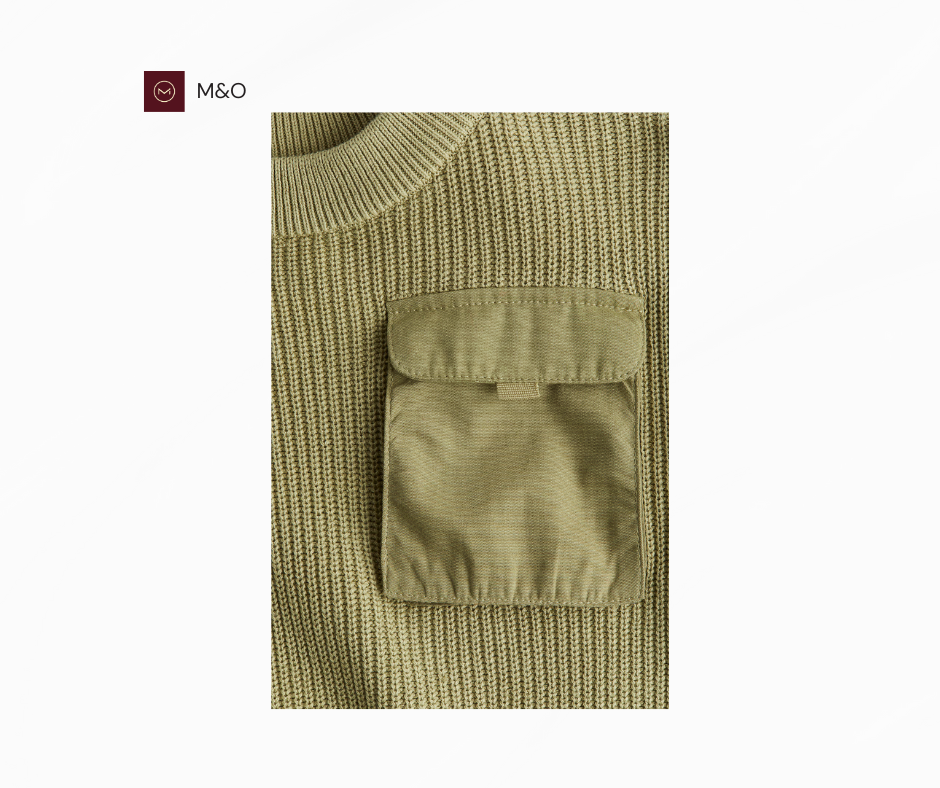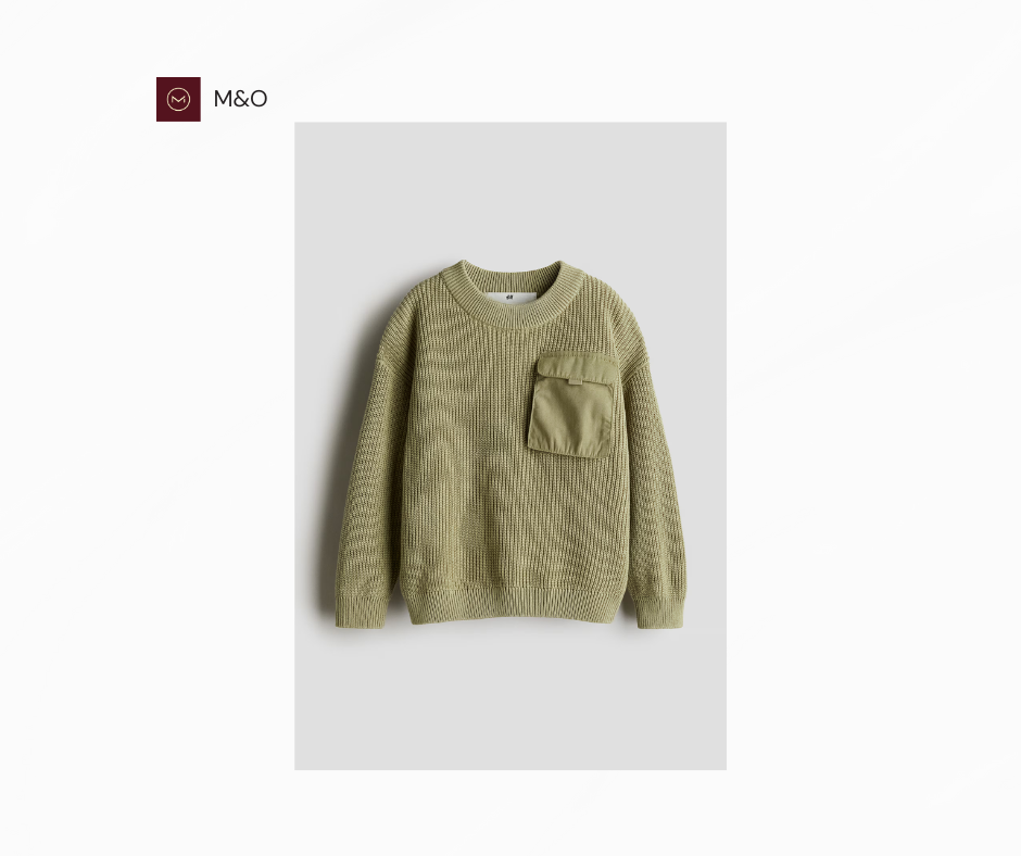 این پلیور از پنبه نرم با بافت کشباف تهیه شده و دارای جیب دکمهدار در قسمت جلو است. یقه گرد و کشباف، سرشانههای افتاده و لبههای آستین و پایین لباس نیز دارای کشباف هستند که به راحتی و زیبایی لباس میافزاید.