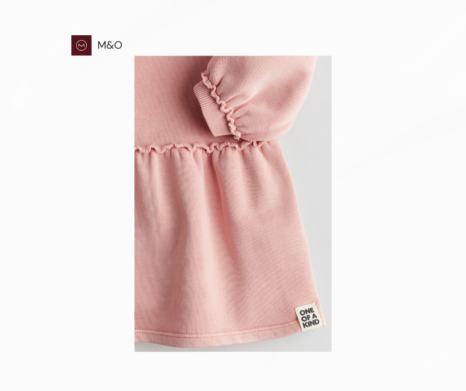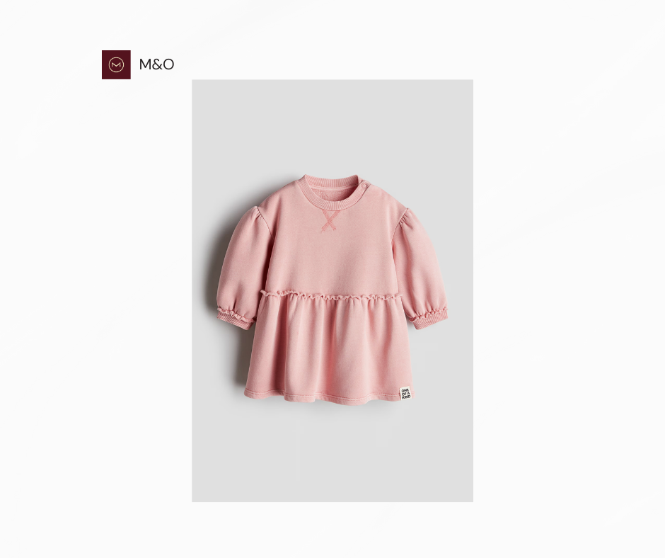 این پیراهن از پارچه سویشرتی با داخل نرم و برسخورده ساخته شده و دارای تزئینات چیندار با لبههای خام است. یقه گرد با نوار کشباف و دکمههای فشاری در یک طرف (در سایزهای ۲ تا ۴ سال بدون دکمه)، شانههای به شدت افتاده و آستینهای پفی بلند با سرآستینهای کشباف از ویژگیهای این پیراهن هستند. درز جمعشده در بالای دامن گشاد نیز به طراحی آن افزوده شده است.